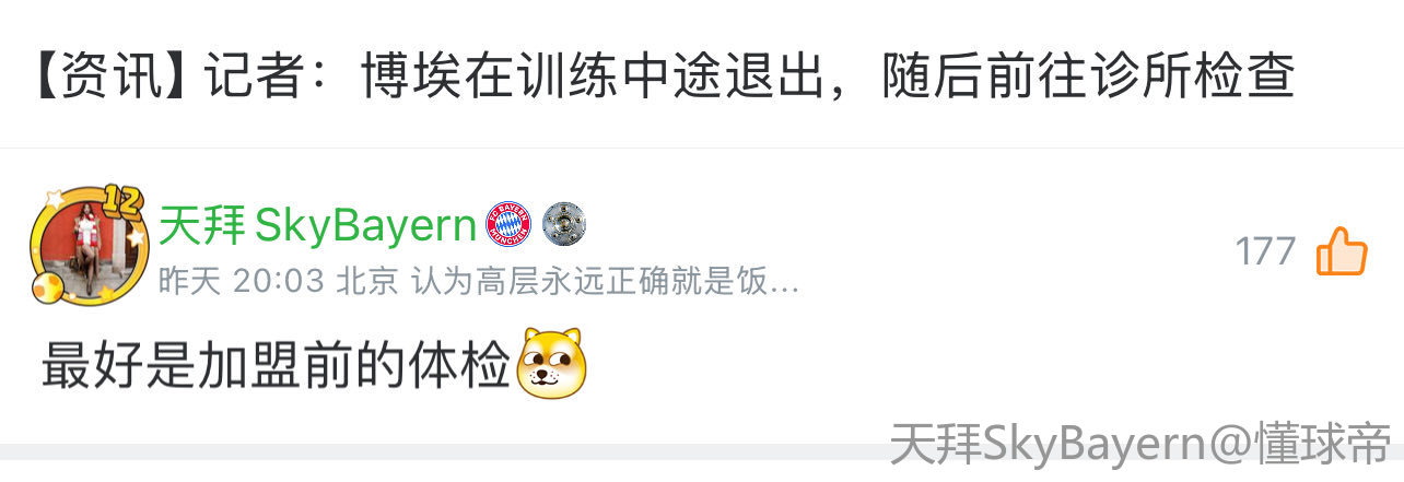 02-05 20:35德天空:博埃昨天因伤退出拜仁训练,今天需通过体检才能转会