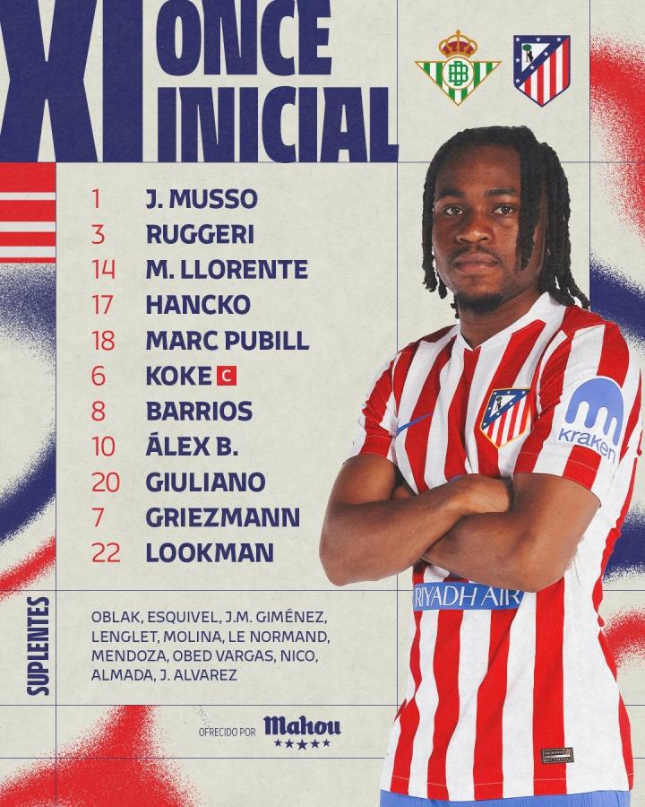 马竞客战贝蒂斯:格列兹曼、小西蒙尼首发出战,卢克曼首秀