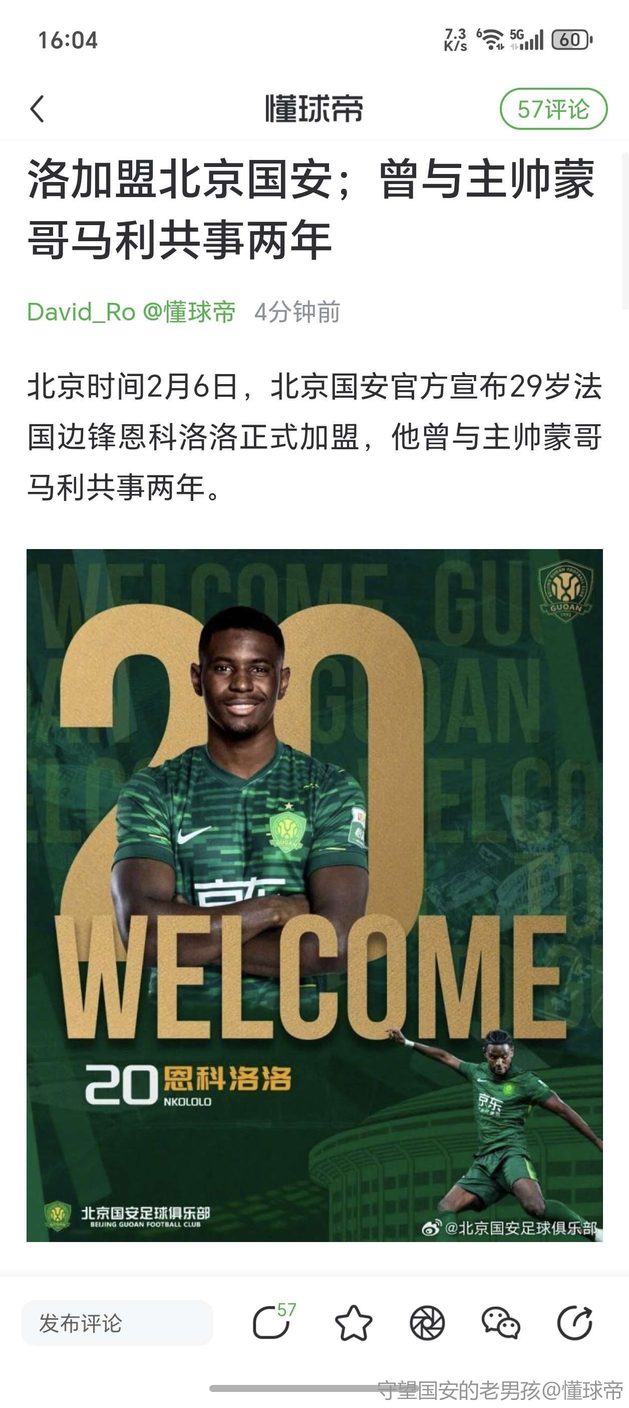 扫描下载懂球帝首页>动态> 官方:29岁法国边锋恩科洛洛加盟北京国安;曾与主帅蒙哥马利共事两年