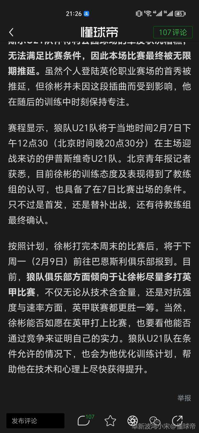 02-06 18:58官方公告显示徐彬加盟的是巴恩斯利U21,并将同时效力狼队U21