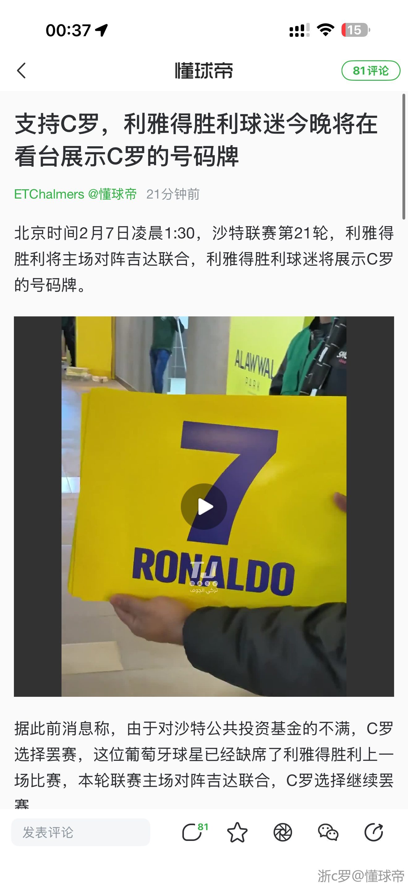 02-07 00:49支持C罗,利雅得胜利球迷今晚将在看台展示C罗的号码牌