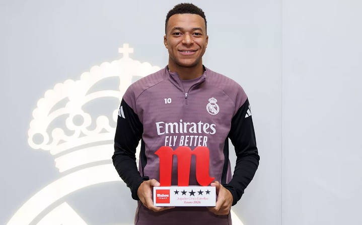 扫描下载懂球帝首页>动态> 荣耀时刻,姆巴佩在训练基地领取了皇马1月最佳球员奖杯