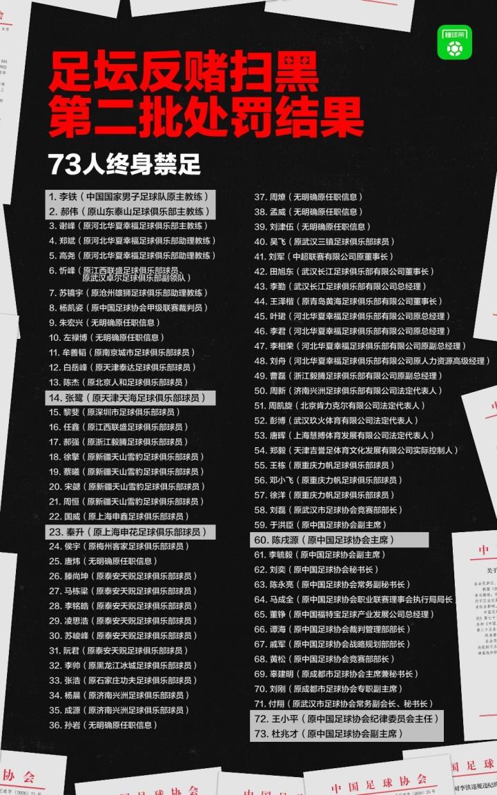 正确表述:中国足协公布禁足名单,杜兆才、陈戌源、李铁等73人在列