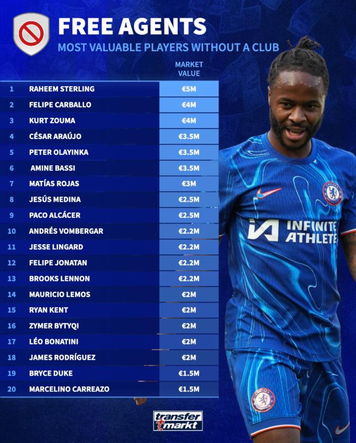 扫描下载懂球帝首页>动态> 懂球号> 这是身价最高的自由球员排行榜: 名将斯特林榜首