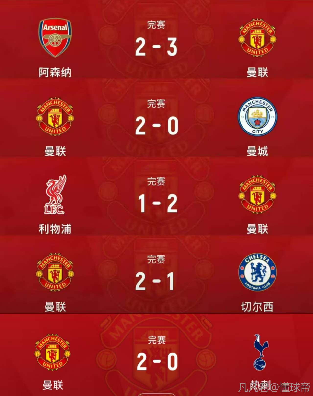 扫描下载懂球帝首页>动态> 魔鬼赛程我才是魔鬼!曼联1个月内连斩曼城、阿森纳和热刺