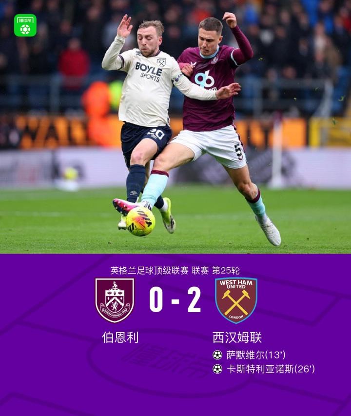 北京时间2月7日英格兰足球顶级联赛 联赛 第25轮,伯恩利主场对阵西汉姆联。上半场西汉姆联萨默维尔破门首开记录,随后卡斯特利亚诺斯头槌破门扩大领先优势。最终比分伯恩利 0-2 西汉姆联。