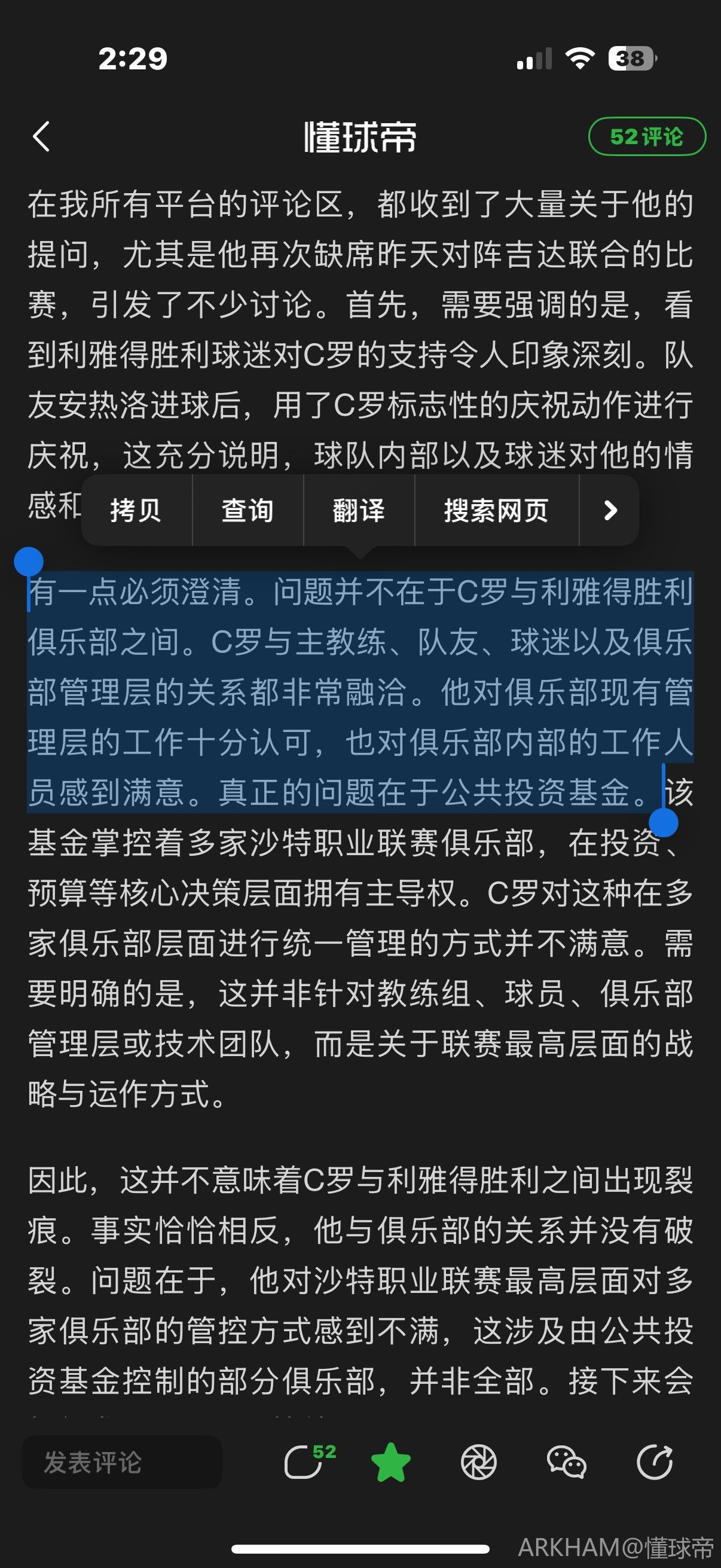 “有一点必须澄清。问题并不在于C罗与利雅得胜利俱乐部之间。C罗与主教练、队友、球迷以及俱乐部管理层的关系都非常融洽他对俱乐部现有管理层的工作十分认可,也对俱乐部内部的工作人员感到满意。真正的问题在于公共投资基金。该基金掌控着多家沙特职业联赛俱乐部,在投资、预算等核心决策层面拥有主导权。C罗对这种在多家俱乐部层面进行统一管理的方式并不满意。需要明确的是,这并非针对教练组、球员、俱乐部管理层或技术团队,而是关于联赛最高层面的战略与运作方式。”那些群体装看不见,装不知道,就知道汪汪叫