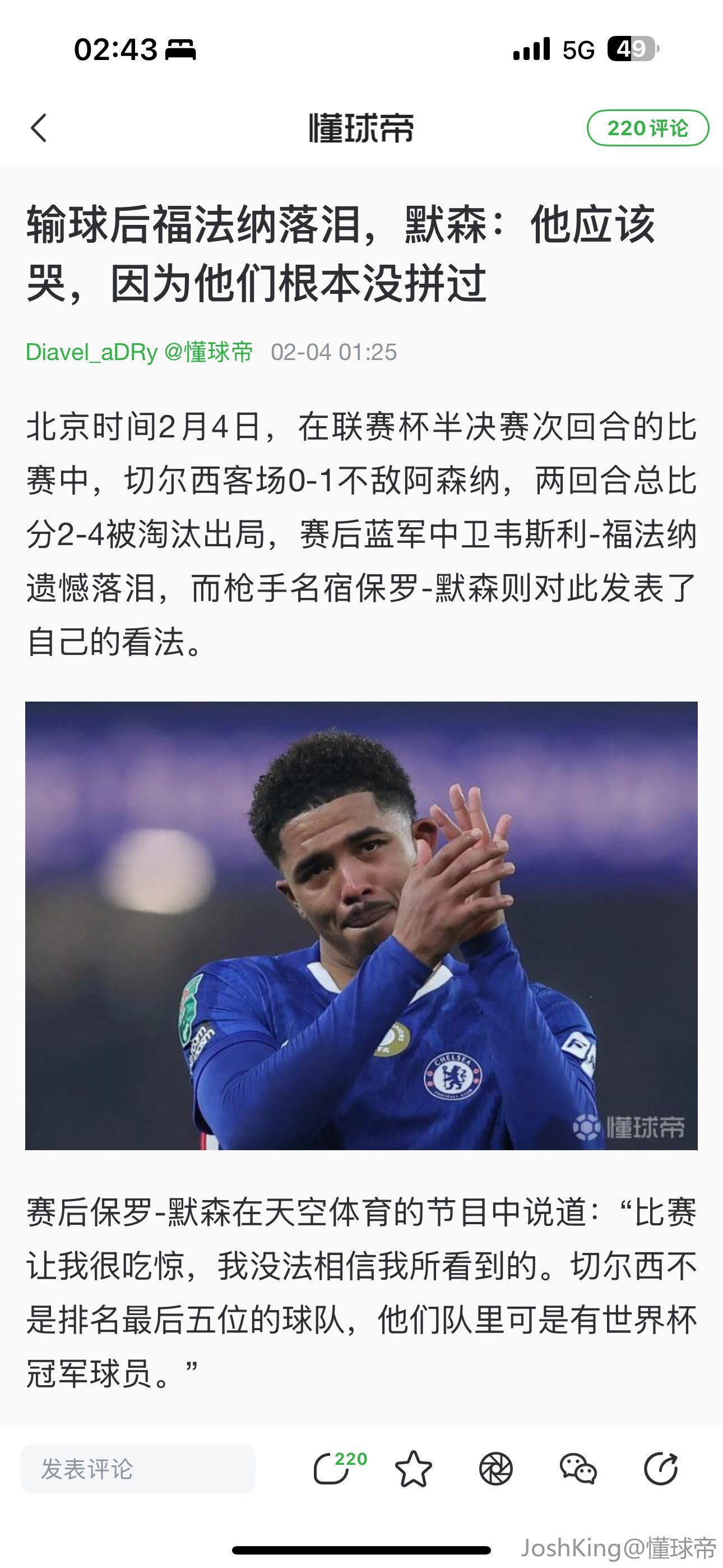 该场比赛赛后,切尔西中卫福法纳被拍到落泪的画面,也反映出蓝军球员同样被失利情绪所吞没。