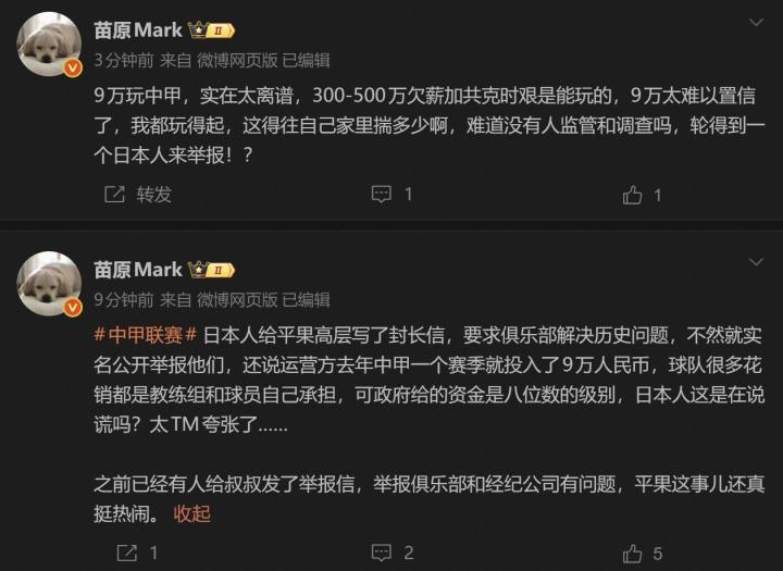 苗原还写道:“9万玩中甲,实在太离谱,300-500万欠薪加共克时艰是能玩的,9万太难以置信了,我都玩得起,这得往自己家里揣多少啊,难道没有人监管和调查吗,轮得到一个日本人来举报!?”