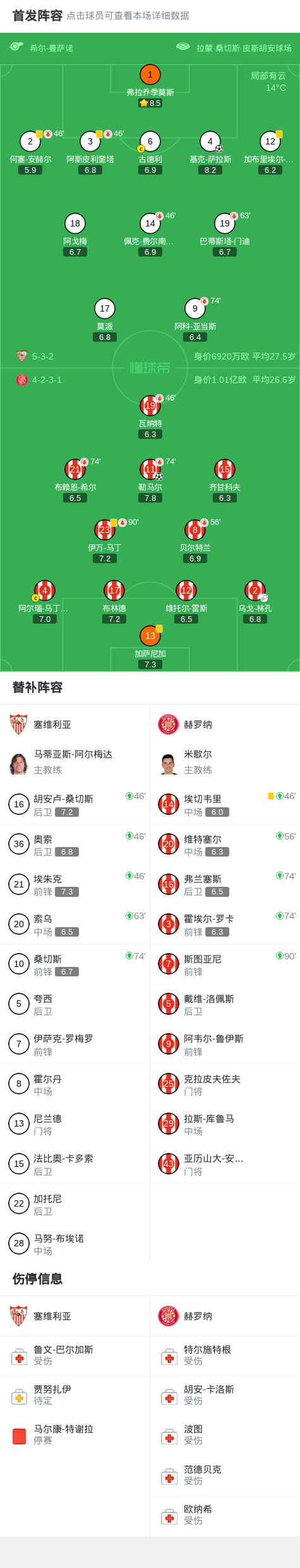 懂球帝首页>动态> 塞维利亚1-1赫罗纳,勒马尔破僵,基克-萨拉斯扳平比分