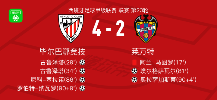 半场战报:毕尔巴鄂竞技2-0莱万特,古鲁泽塔梅开二度