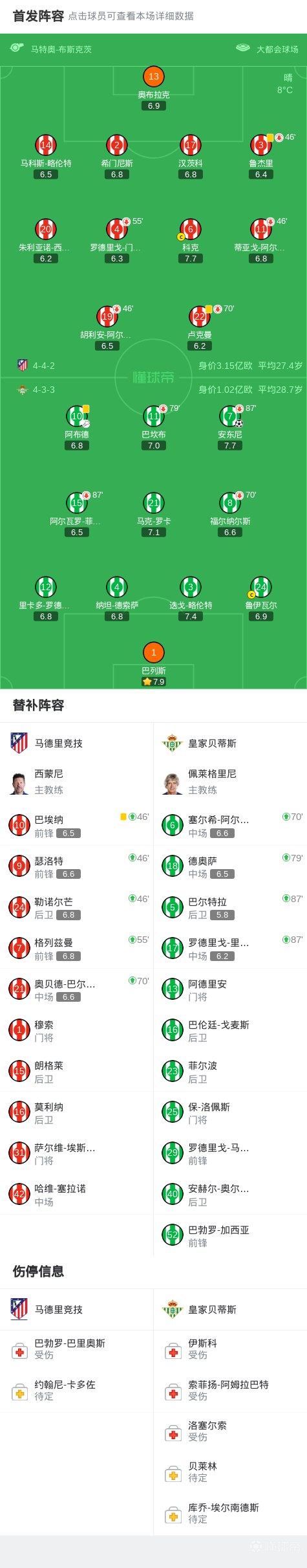 02-09 03:42马德里竞技 vs 皇家贝蒂斯 比赛动态