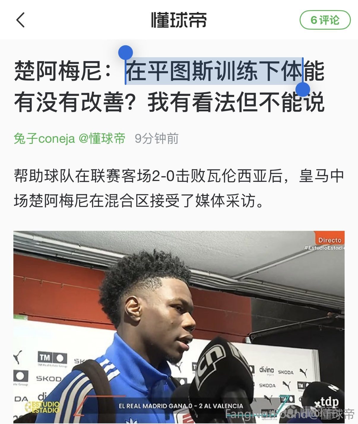 扫描下载懂球帝首页>动态> 楚阿梅尼:在平图斯训练下体能有没有改善?我有看法但不能说