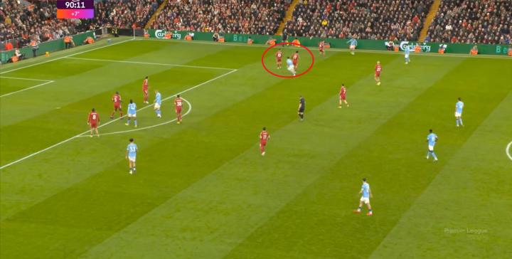 于是,在真的通过进攻画面调动起场上的情绪之后,利物浦开始能将压力施加到曼城的后卫身上了: