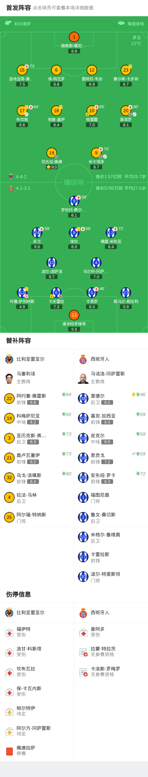 北京时间2月10日西班牙足球甲级联赛 联赛 第23轮,比利亚雷亚尔主场对阵西班牙人。比利亚雷亚尔米卡塔泽破门,尼古拉-佩佩破门,莫莱罗破门。西班牙人卡夫雷拉破门,何塞-萨利纳斯自摆乌龙。最终比分比利亚雷亚尔 4-1 西班牙人。