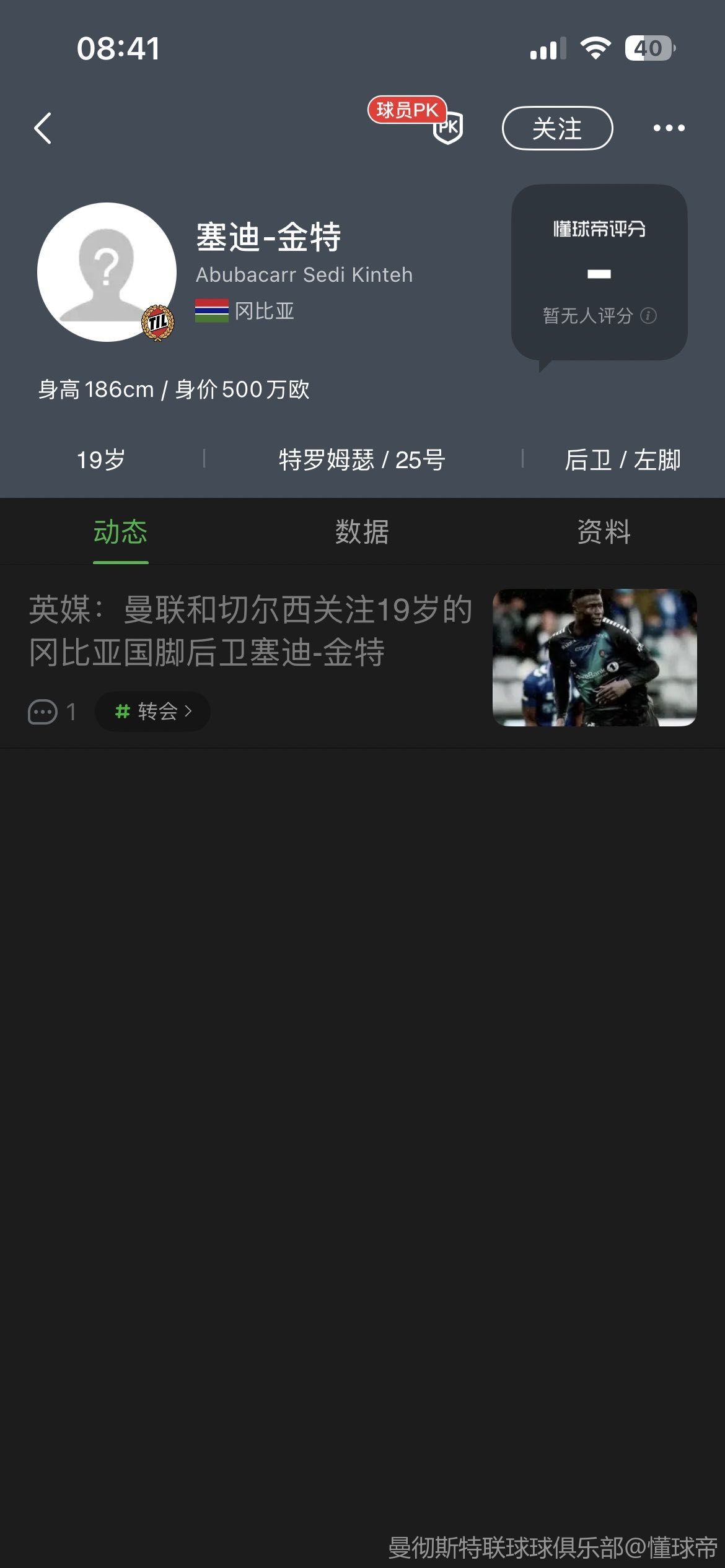 扫描下载懂球帝首页>动态> 英媒:曼联和切尔西关注19岁的冈比亚国脚后卫塞迪-金特