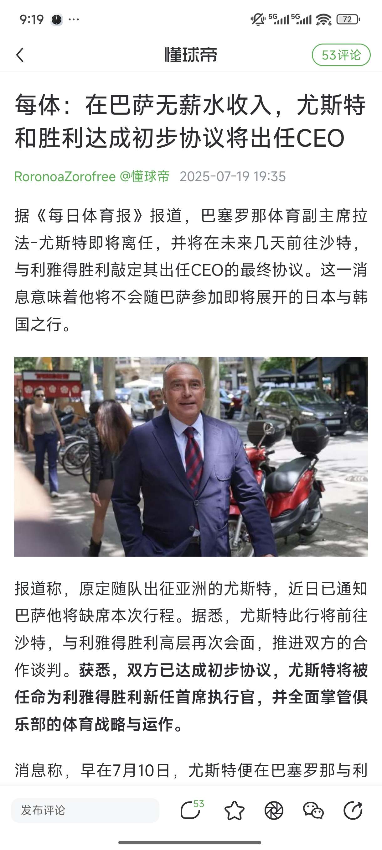 据《每日体育报》报道,拉斐尔-尤斯特,1962年出生于巴塞罗那,在拉波尔塔正式辞职后,被任命为巴萨临时主席,并将履职至7月1日。他此前担任俱乐部第一副主席及体育事务负责人,此次接任属于过渡性质,直至3月15日主席选举完成并产生新一任管理层。在接下来的五个月内,尤斯特将与现有董事会成员共同管理俱乐部事务。何塞普-库贝尔斯出任副主席兼秘书,阿方斯-卡斯特罗担任财务主管,董事成员包括何塞普-伊格纳西-马西亚、安赫尔-里乌达尔巴斯、胡安-索莱-伊-苏斯特以及西斯科-普霍尔。其余九名董事已于本周一与拉波尔塔一同辞职。