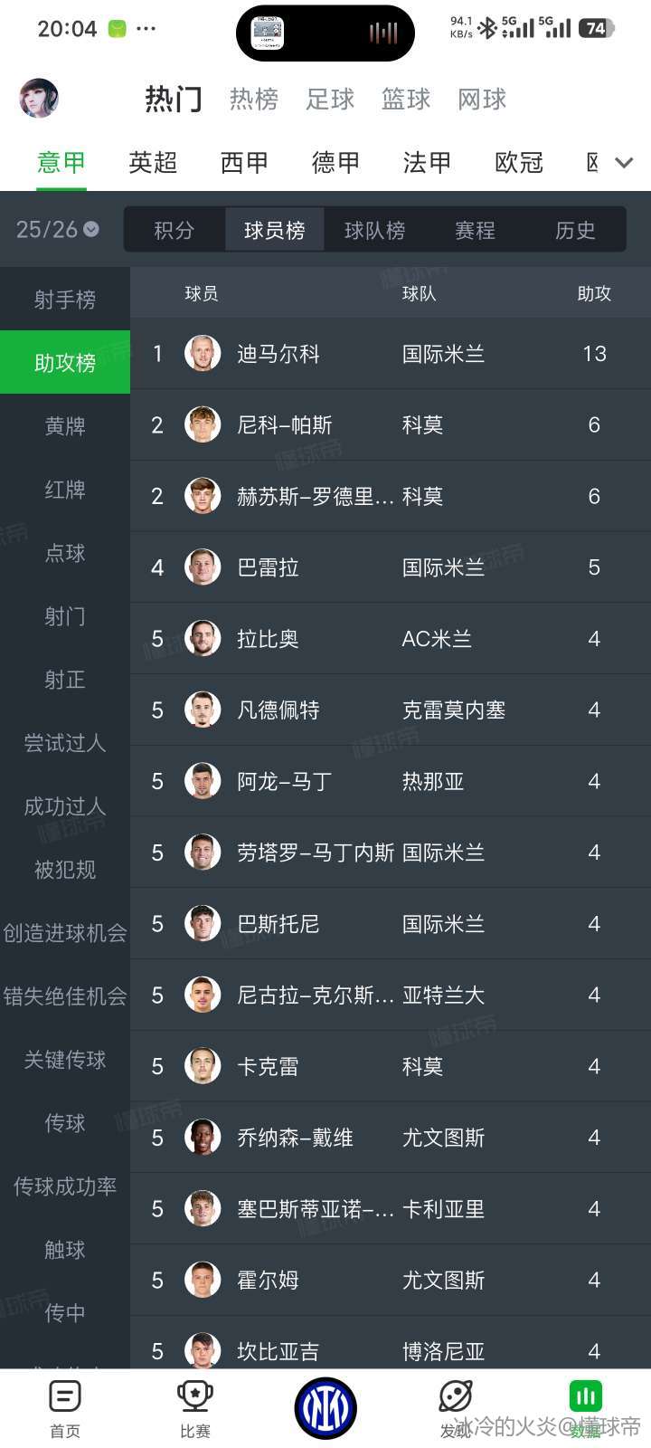 迪哥明明是13次助攻