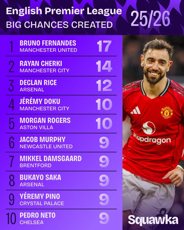 扫描下载懂球帝首页>动态> 英超创造重大机会榜:B费17次领跑,谢尔基14次、赖斯12次