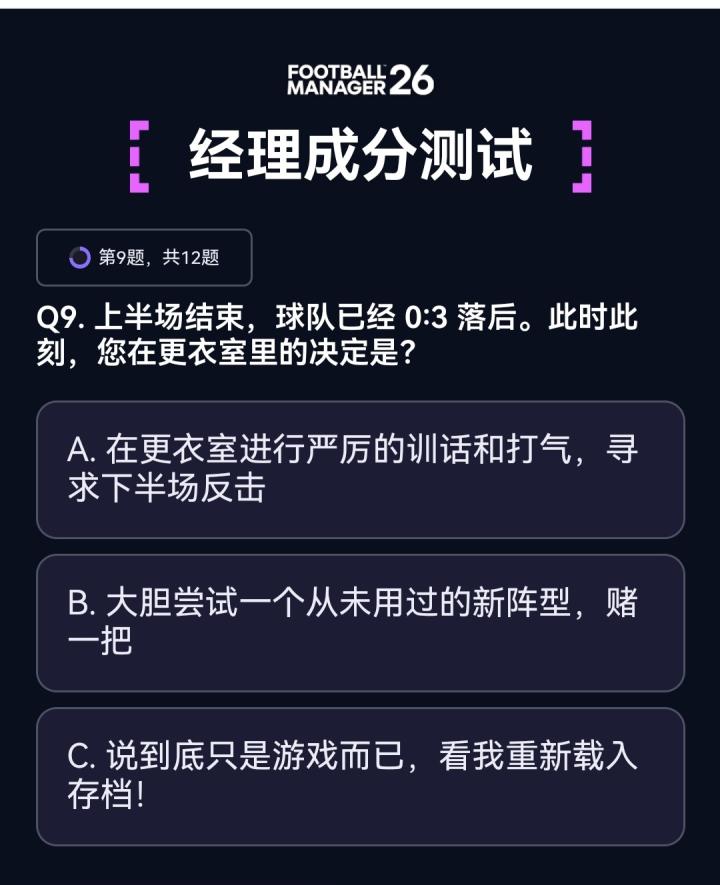 现在,我们邀请您以全新的身份审视自己。《足球经理26》正式推出“经理成分测验” ,为您量身打造一次数字化帅位模拟。