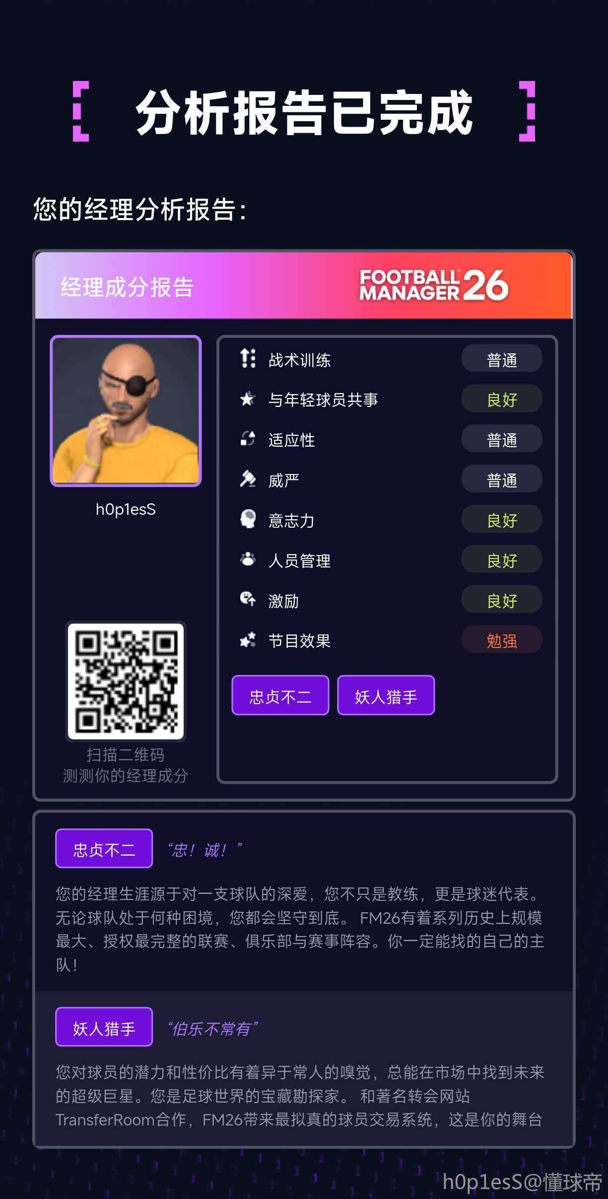 完成全部12题后,系统将生成您的专属 “经理成分分析报告”,以经典的《足球经理》属性面板形式,展示您在战术设计、青训培养、团队激励等八大维度的能力数值,并会为您贴上极具风格的个性标签,让您更直观地理解自己的执教倾向与潜在优势,明晰自己的执教DNA。在这里无需承担真实世界下课的风险,即可找到属于自己的答案。