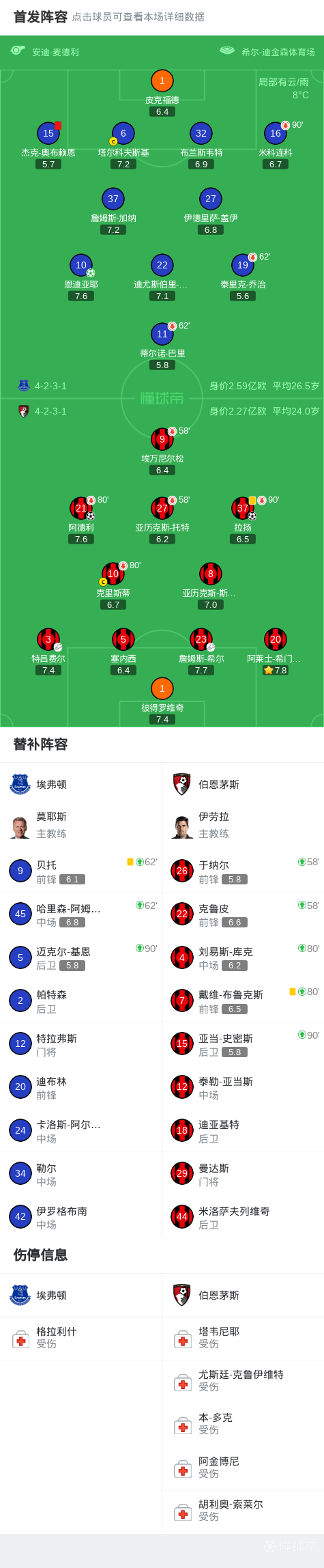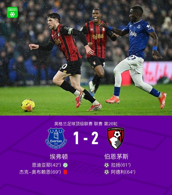 扫描下载懂球帝首页>动态> 伯恩茅斯2-1逆转十人埃弗顿,拉扬、阿德利破门,恩迪亚耶点射