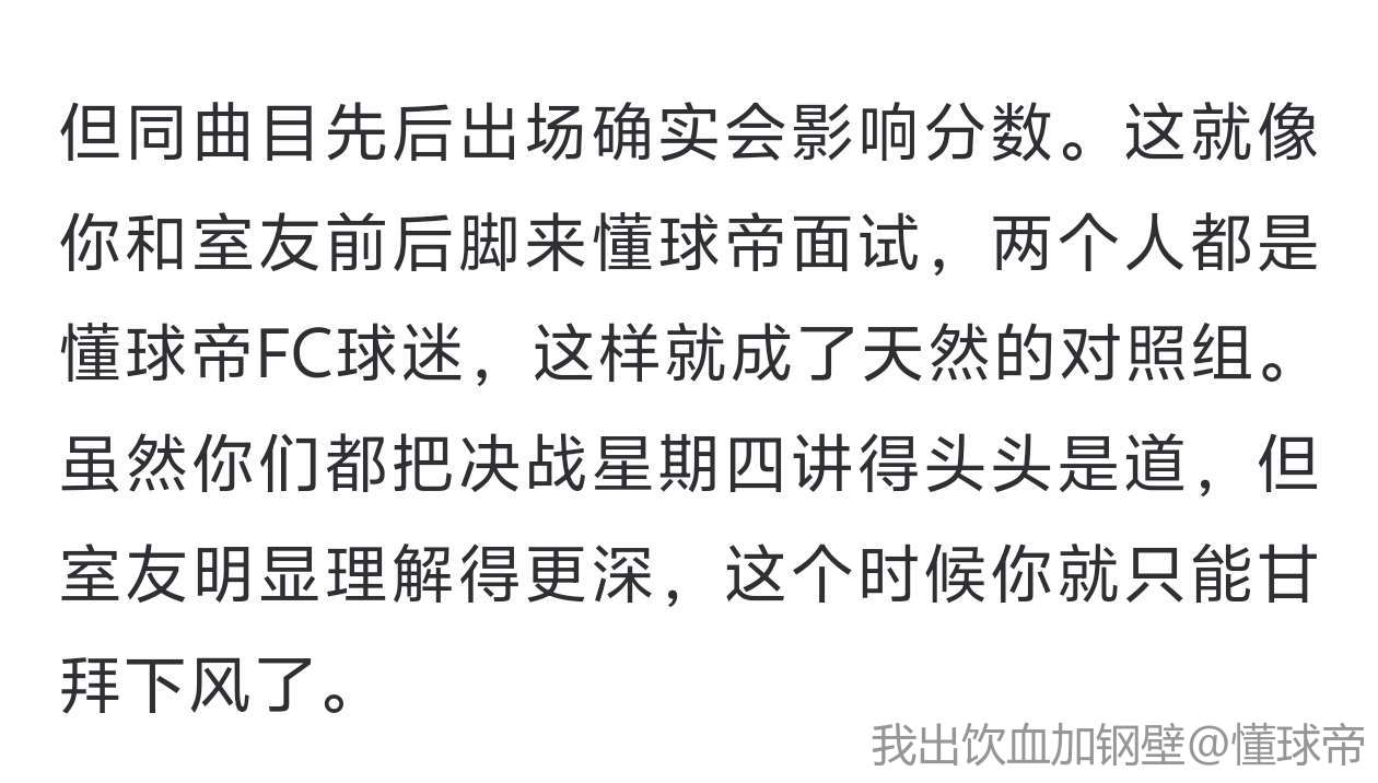 但同曲目先后出场确实会影响分数。这就像你和室友前后脚来懂球帝面试,两个人都是懂球帝FC球迷,这样就成了天然的对照组。虽然你们都把决战星期四讲得头头是道,但室友明显理解得更深,这个时候你就只能甘拜下风了。