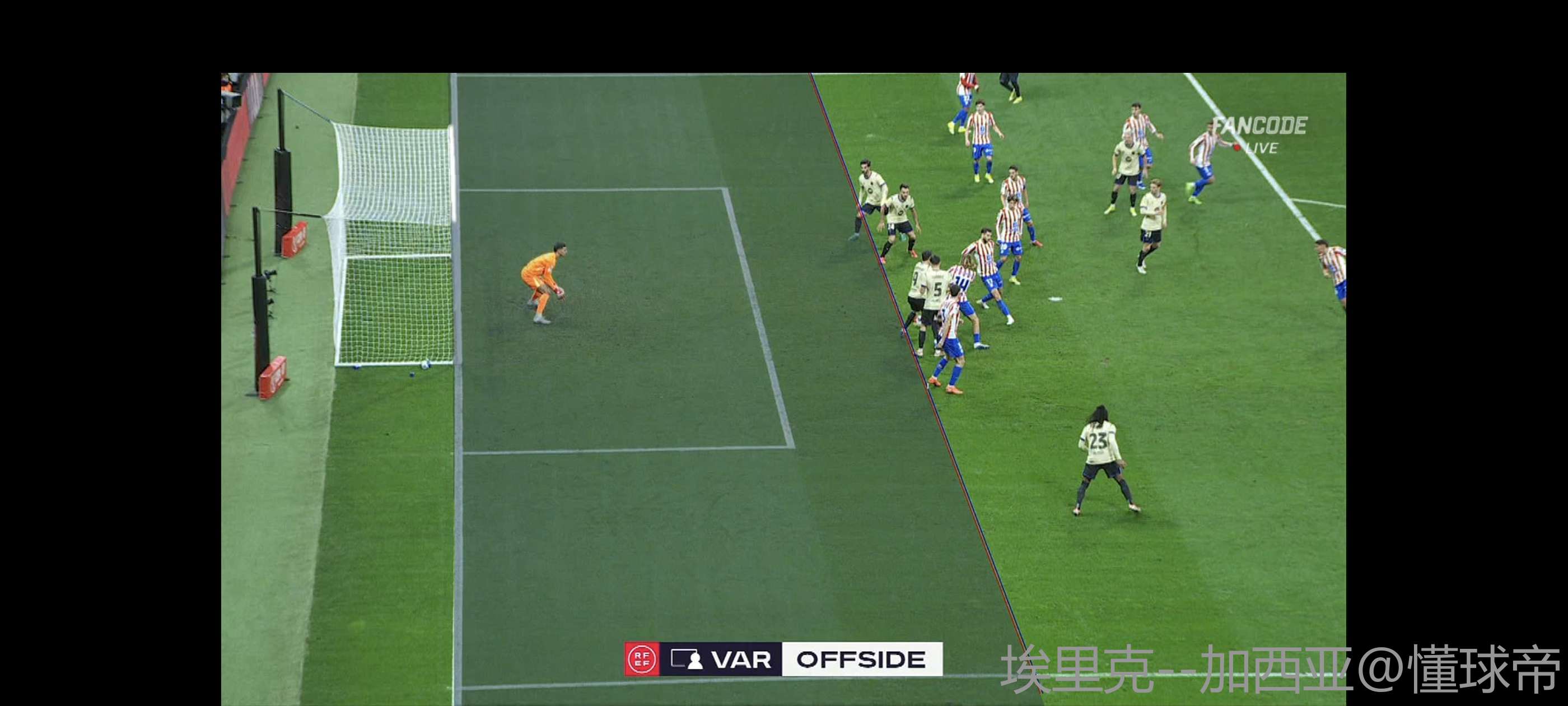 第一下莱万库巴西都不越位,射门打在莱万身上弹给了库巴西,所以算莱万传球。此时即将反弹的一瞬间莱万和库巴西的身体都有一部分(脚)在马竞最后一名防守队员身后,因此二者都是属于介于门将和最后一名防守队员之间,这种情况接球队员必须在球的后面接球才不越位,而库巴西明显超出球的位置之后许多了,所以越位。