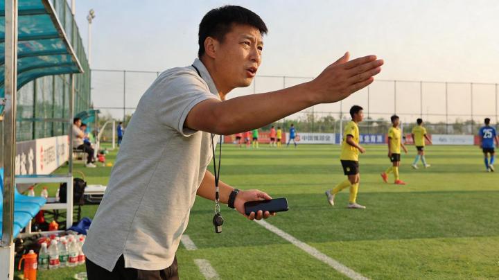 球场边上,教练一手拿着战术板,一手举着手机:“注意边路套上!注意跑位”.......