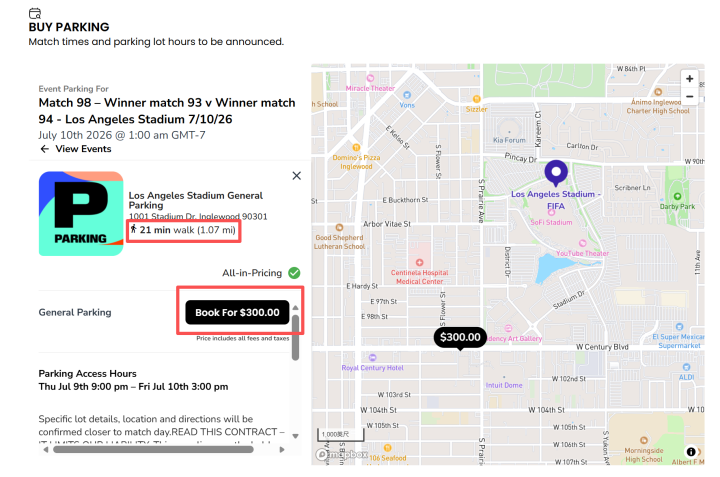 看场球停车费要掏2,000块?是的,你没看错。在由JustPrak运营的国际足联2026世界杯官方停车网站上,点开洛杉矶SoFi体育场计划于7月10日承办的1/4决赛,你会发现上面赫然写着预订当日停车证所需要付出的价格——300美元。