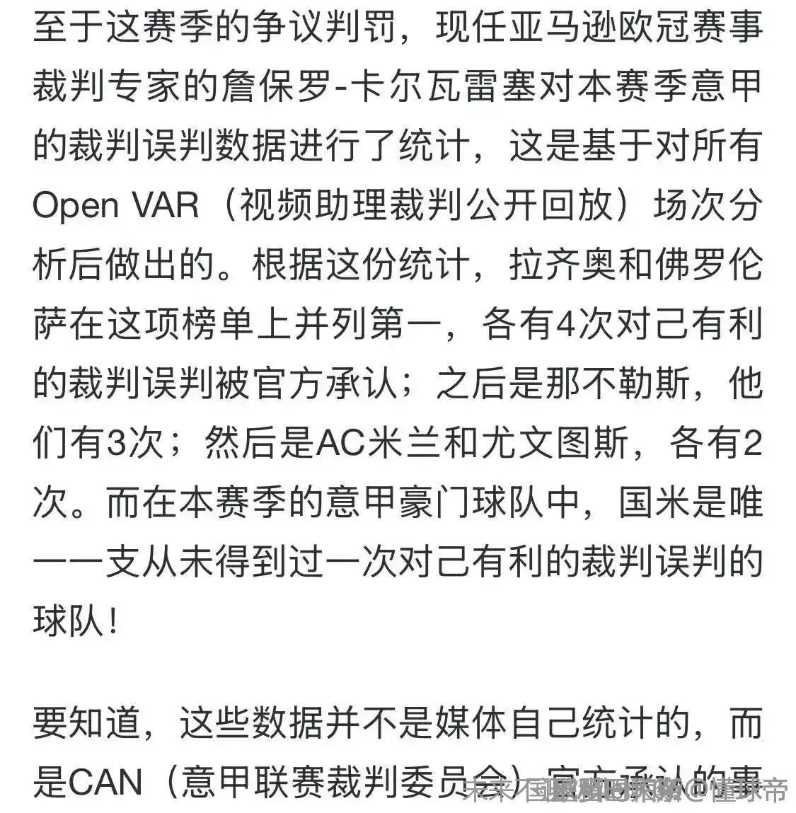 最后,管理层作为最后的公开表态,有点小家子气,没必要上纲上线。吃亏和获利逻辑上都是50%:50%,认了就算了,又不是没占过便宜。当然,对于俱乐部来说,也许是个向意甲联盟施压的好机会,算是政治行为,没必要过度解读了。