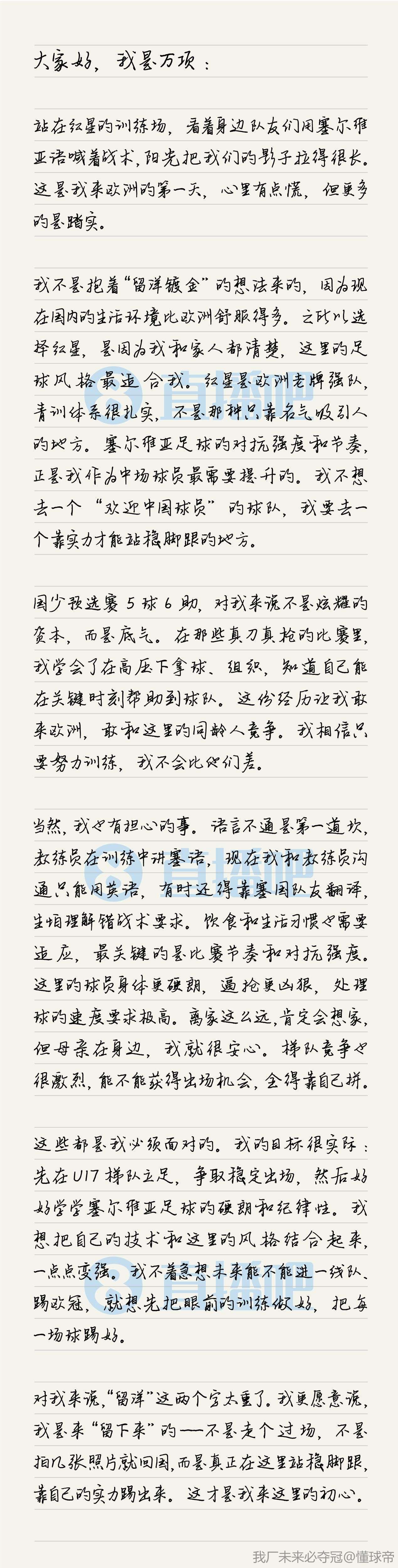 与相当一部分有天资的球员立志早早在欧洲主流联赛立足不同,万项对于留洋有着独到而清醒的认知。在个人亲笔信中,万项这样写道:“我不是抱着留洋镀金的想法来的,因为现在国内的生活环境比欧洲舒服得多。之所以选择红星,是因为我和家人都清楚,这里的足球风格最适合我。红星是欧洲老牌强队,青训体系很扎实,不是那种只靠名气吸引人的地方。塞尔维亚足球的对抗强度和节奏,正是我作为中场球员最需要提升的。我想去一个靠实力才能站稳脚跟的地方。”