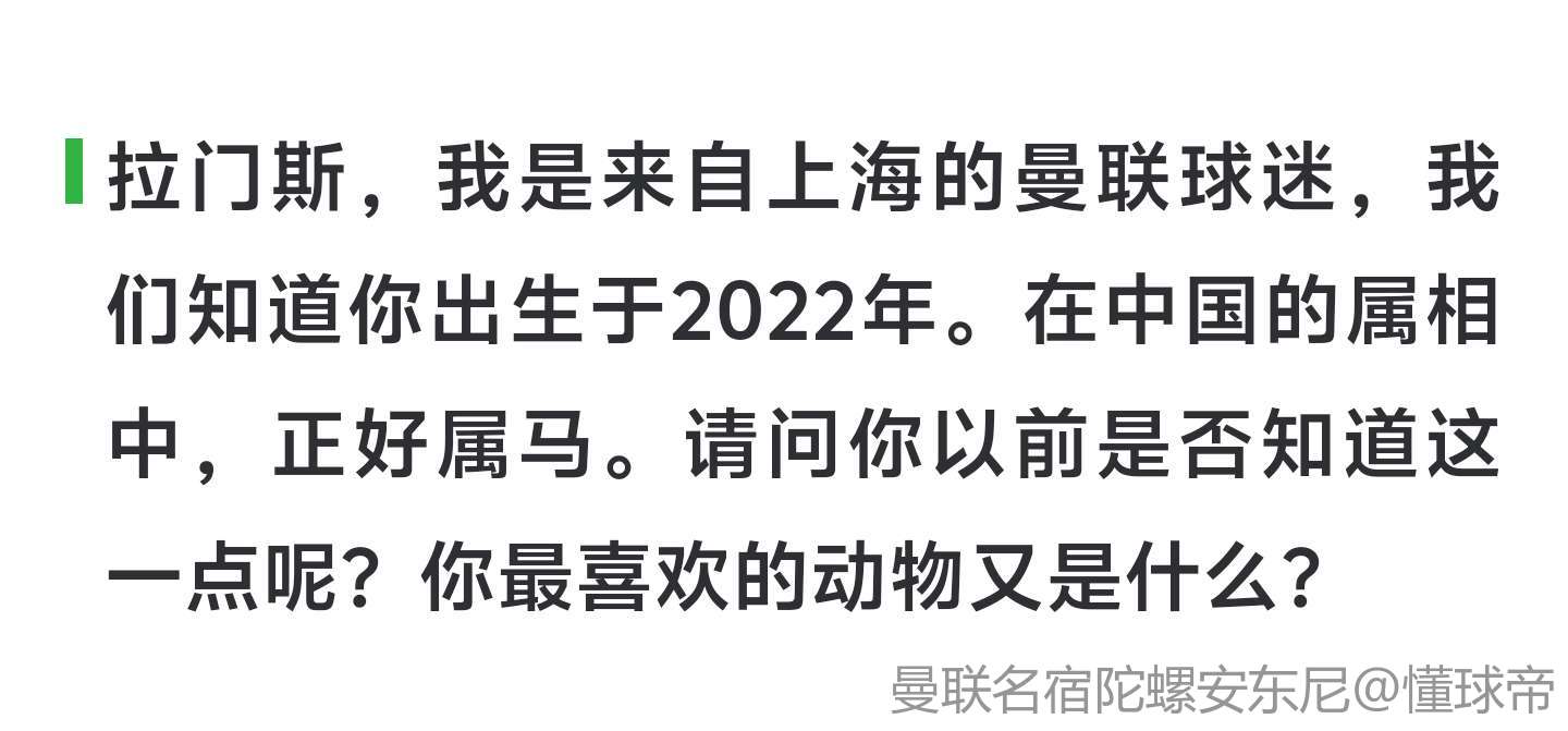 拉门斯,我是来自上海的曼联球迷,我们知道你出生于2002年。在中国的属相中,正好属马。请问你以前是否知道这一点呢?你最喜欢的动物又是什么?