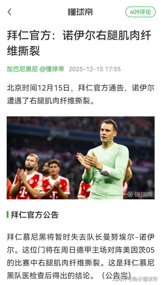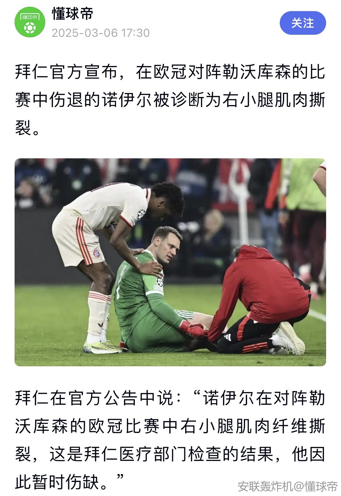 官方:诺伊尔左小腿肌肉纤维撕裂,将暂时缺阵