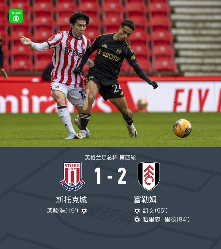 北京时间2月15日英格兰足总杯第四轮,斯托克城对阵富勒姆。斯托克城裴峻浩破门。富勒姆凯文、哈里森-里德分别破门。最终富勒姆客场2-1逆转斯托克城晋级。