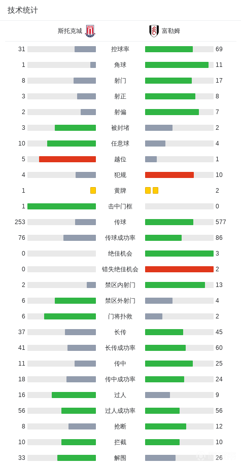 第84分钟,斯托克城后场被抢断,里德破门,富勒姆2-1