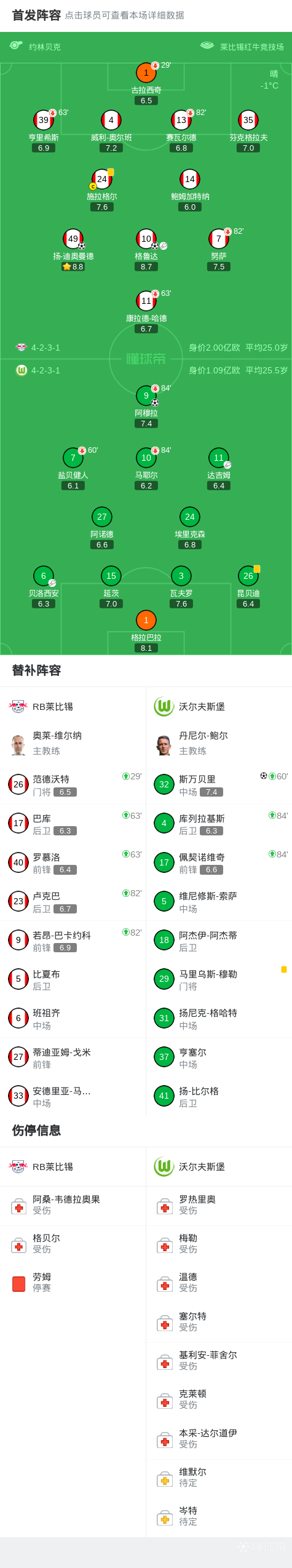 02-16 00:31半场:莱比锡0-0沃尔夫斯堡,格鲁达错失单刀,古拉西奇伤退