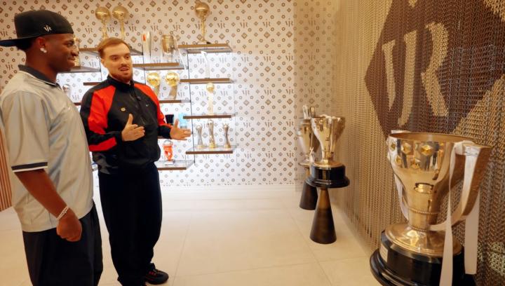 我现在在马德里,就在维尼修斯家门口。今天我们要带大家看看他家里的一些细节,更重要的是,看看足球之外的维尼修斯。我们会陪他去参加一个活动,因为他要发布自己的新球鞋。一路上我们也会在车里聊天。不过在出发前,先参观一下他的家,因为这里有很多他拿到的个人奖杯、皇家马德里的荣誉,我觉得会让你们很惊讶。我们现在真的就在他家门口,敲敲门看看他会不会开门。晚上好。你怎么样?