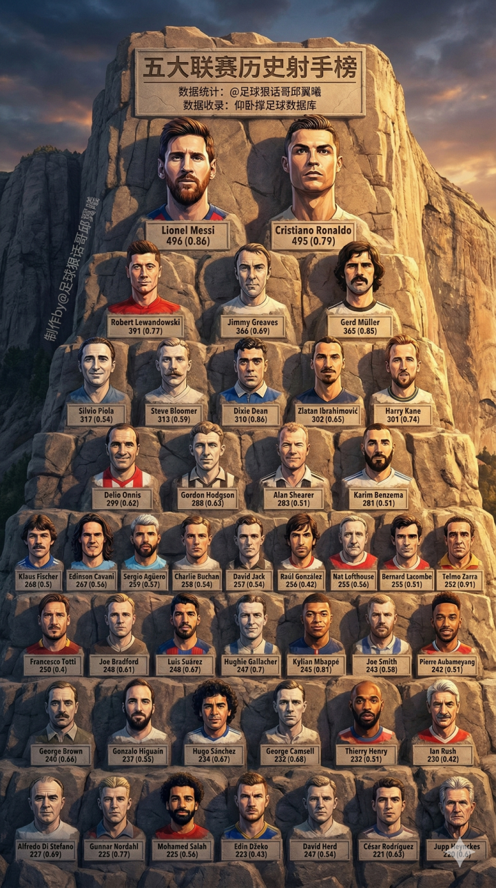 足球狠话哥独家:五大联赛历史射手榜注:皮奥拉意甲...