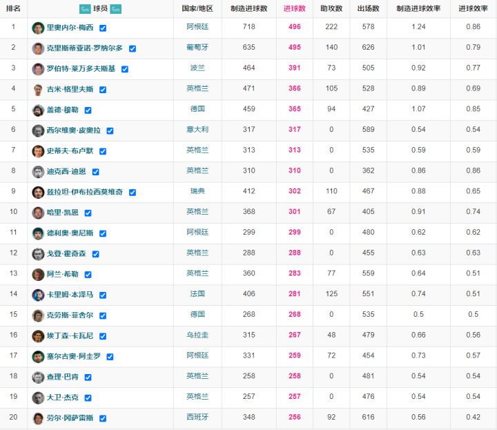 第一排:Lionel Messi 496(0.86)、Cristiano Ronaldo 495(0.79)