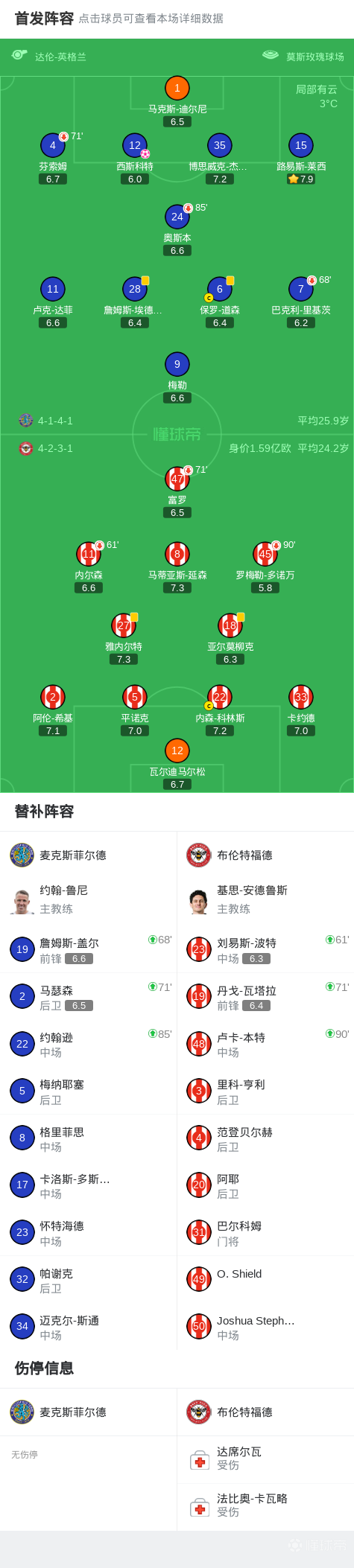 第71分钟,西斯科特俯身头球顶入自家球门,布伦特福德1-0!