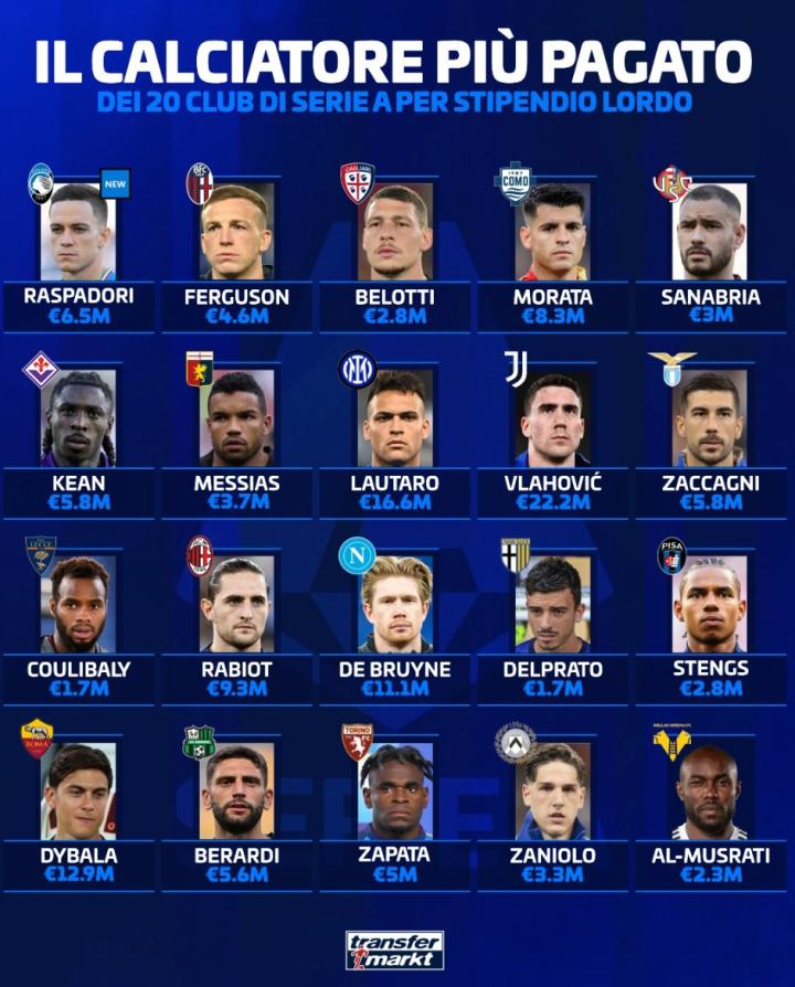 扫描下载懂球帝首页>动态> 德转列意甲各队顶薪球员:弗拉霍维奇2220万第1,劳塔罗1660万