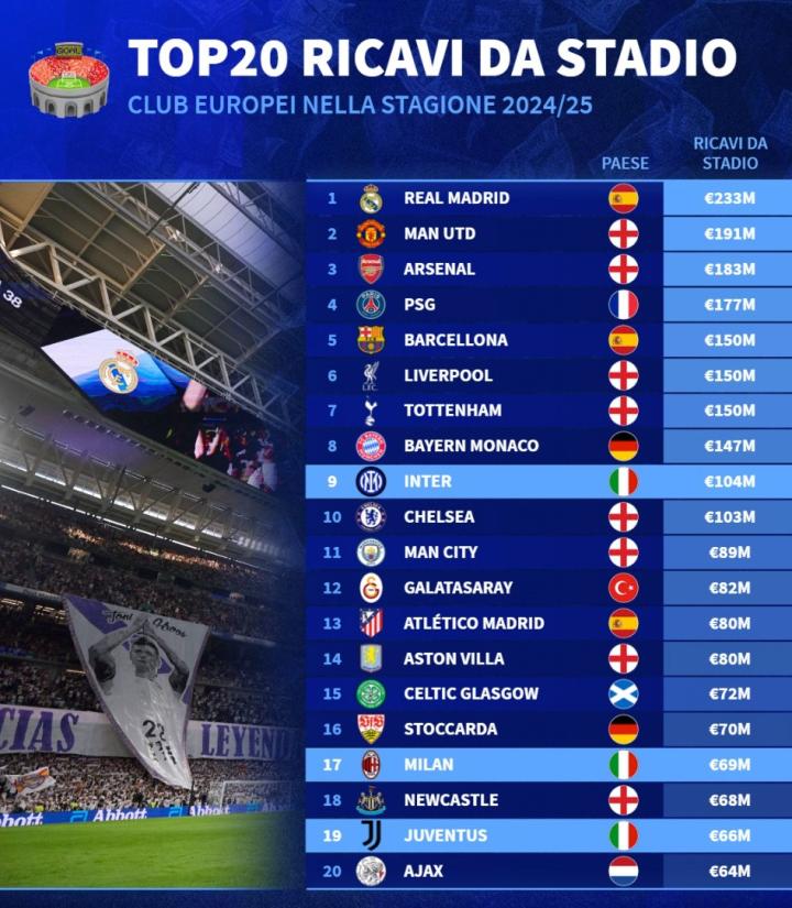 扫描下载懂球帝首页>动态> 上赛季欧洲俱乐部门票收入:皇马2.33亿第1,曼联阿森纳二三位