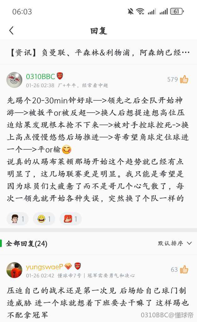感觉厂子现在和前段时间曼城一样,多线作战太累了,想以最小的体力拿下比赛,所以一进球就开始求稳,结果反而赔了夫人又折兵,前段时间曼城也是领先一球就不攻了