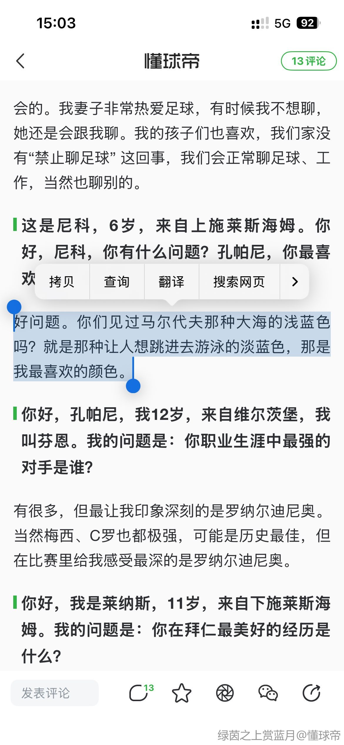 会的。我妻子非常热爱足球,有时候我不想聊,她还是会跟我聊。我的孩子们也喜欢,我们家没有“禁止聊足球” 这回事,我们会正常聊足球、工作,当然也聊别的。