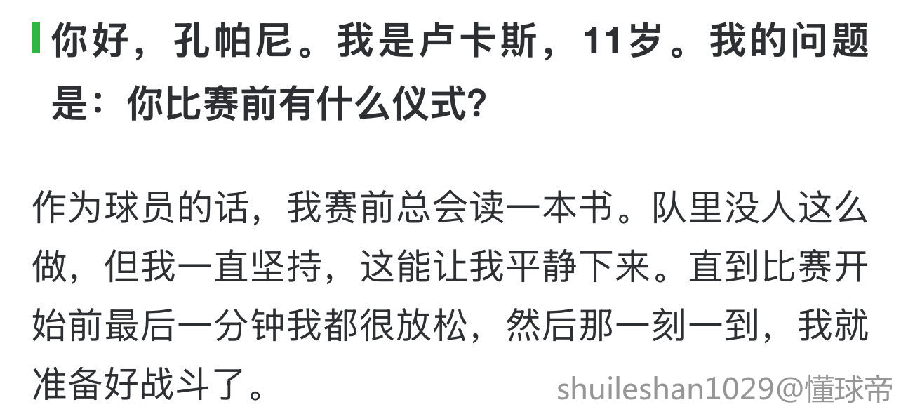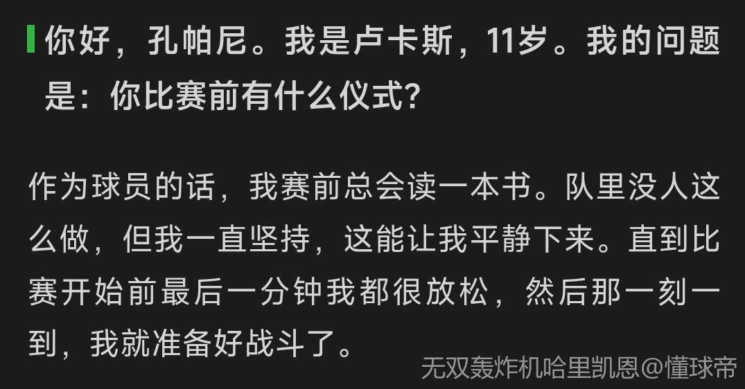 你好,孔帕尼。我是卢卡斯,11岁。我的问题是:你比赛前有什么仪式?