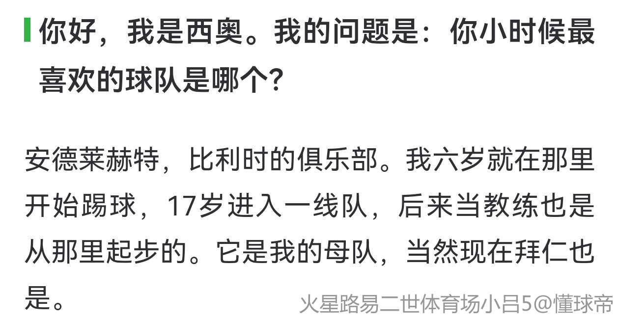 安德莱赫特,比利时的俱乐部。我六岁就在那里开始踢球,17岁进入一线队,后来当教练也是从那里起步的。它是我的母队,当然现在拜仁也是。