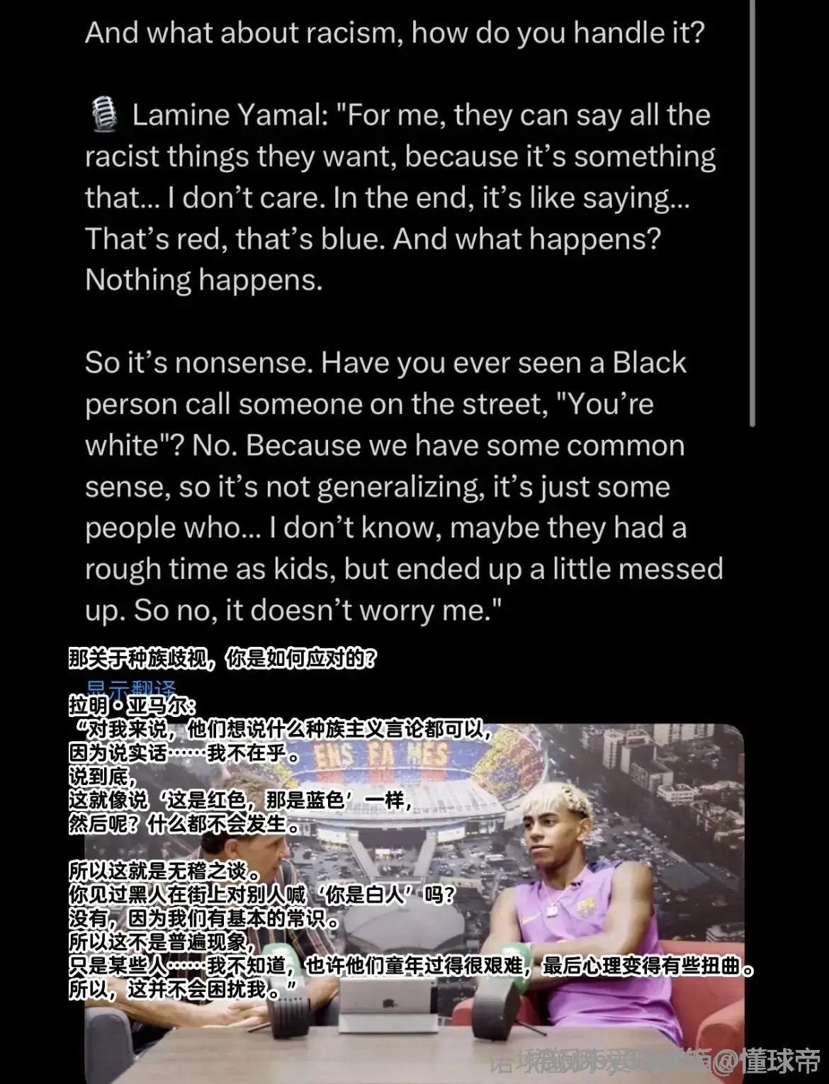 “人们因为他身披‘我们的’队徽而支持他,也有人因为‘我反对这个队徽,所以我反对他的处境’而敌视。如果你不是维尼修斯的球迷,话题往往不是种族歧视本身,而是他是否挑衅。足球太感性,会激发出人最原始的一面。所以悲剧不断重演。”