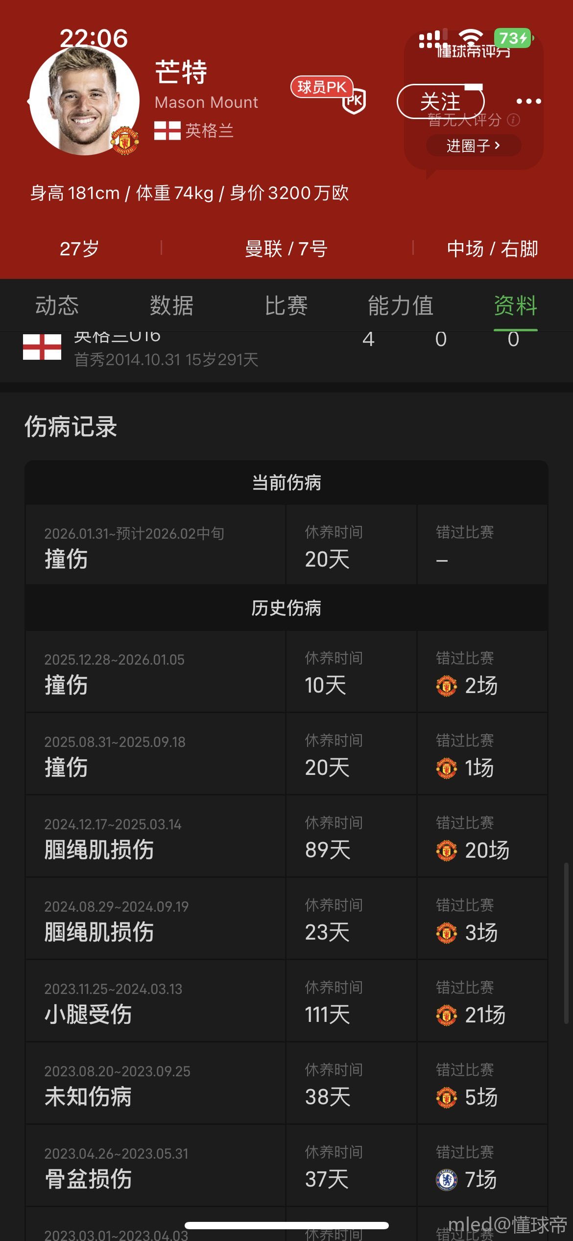 缺席的场数都快和踢的持平了