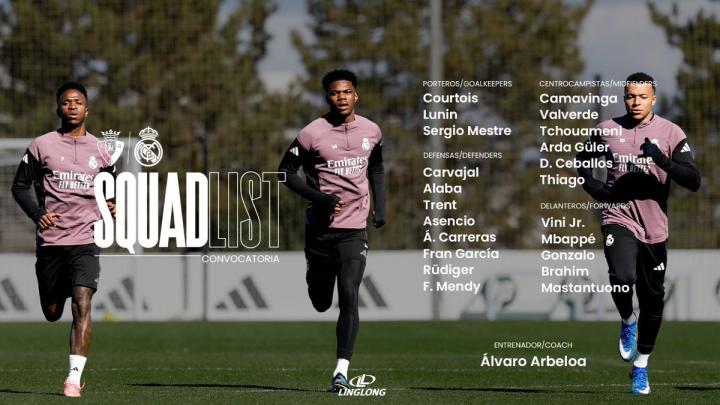 扫描下载懂球帝首页>动态> 皇马客战奥萨苏纳大名单:姆巴佩、维尼修斯领衔,赫伊森伤缺